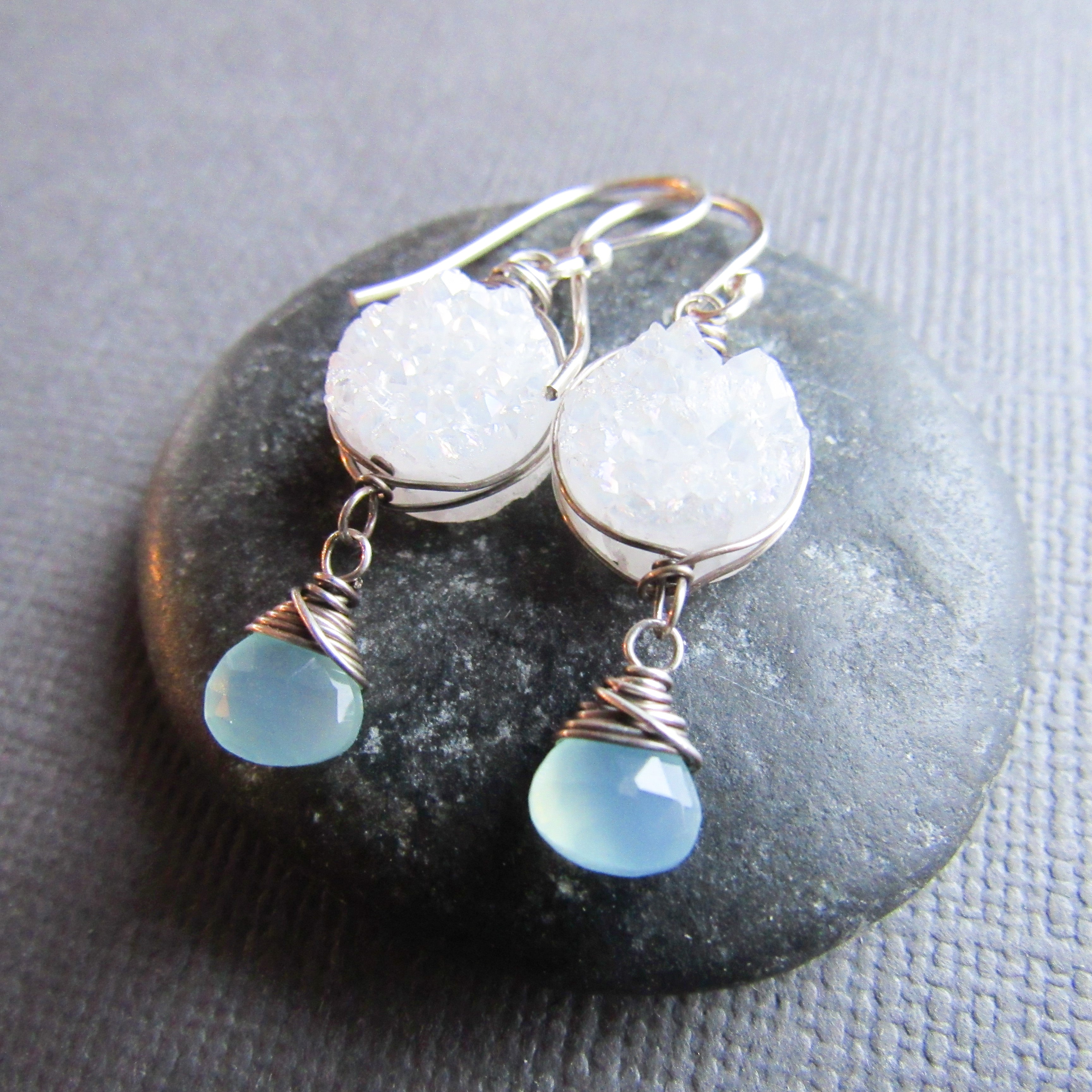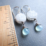 These elegant, one-of-a-kind earrings feature aqua chalcedony and white druzy stones, offering a unique combination of style and beauty.