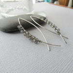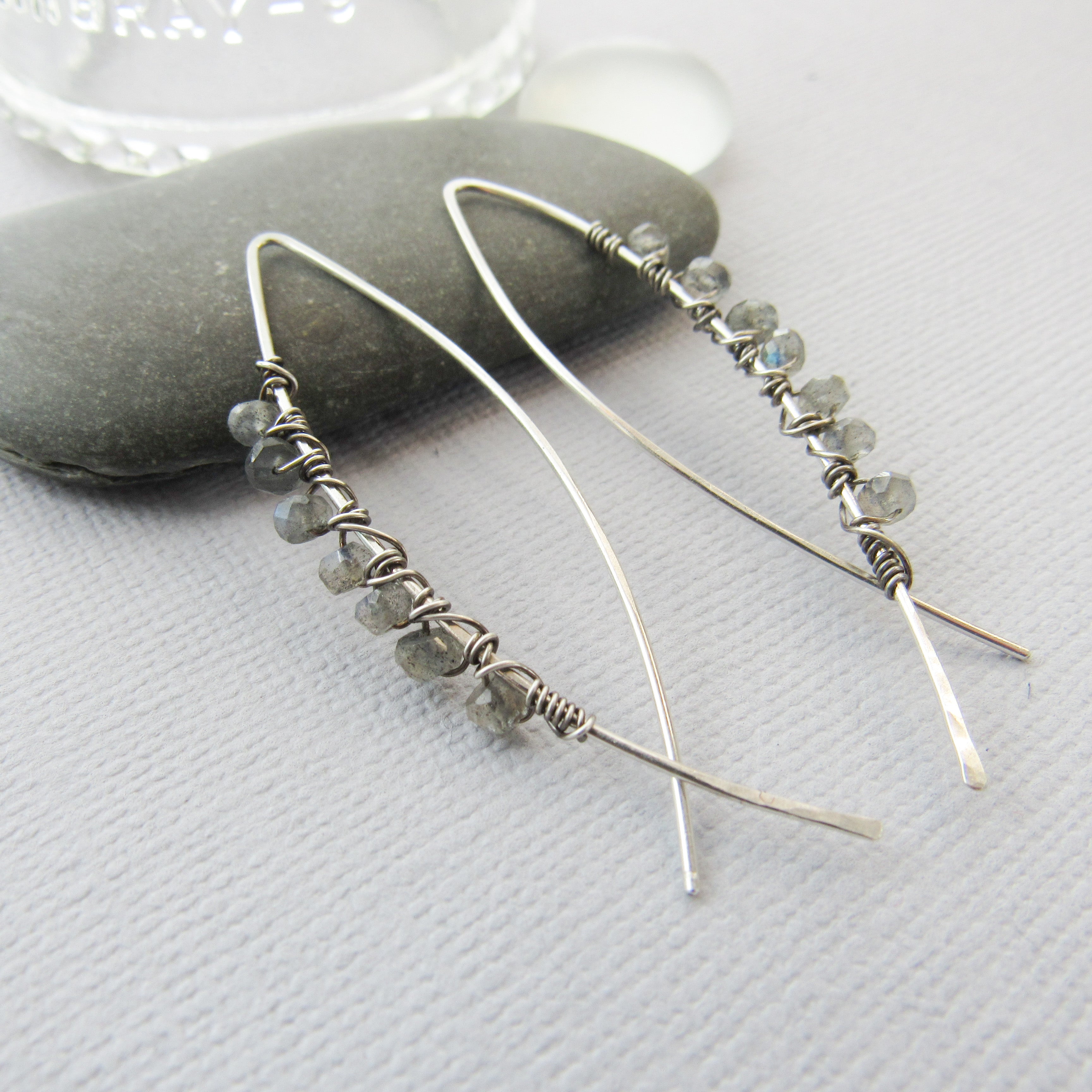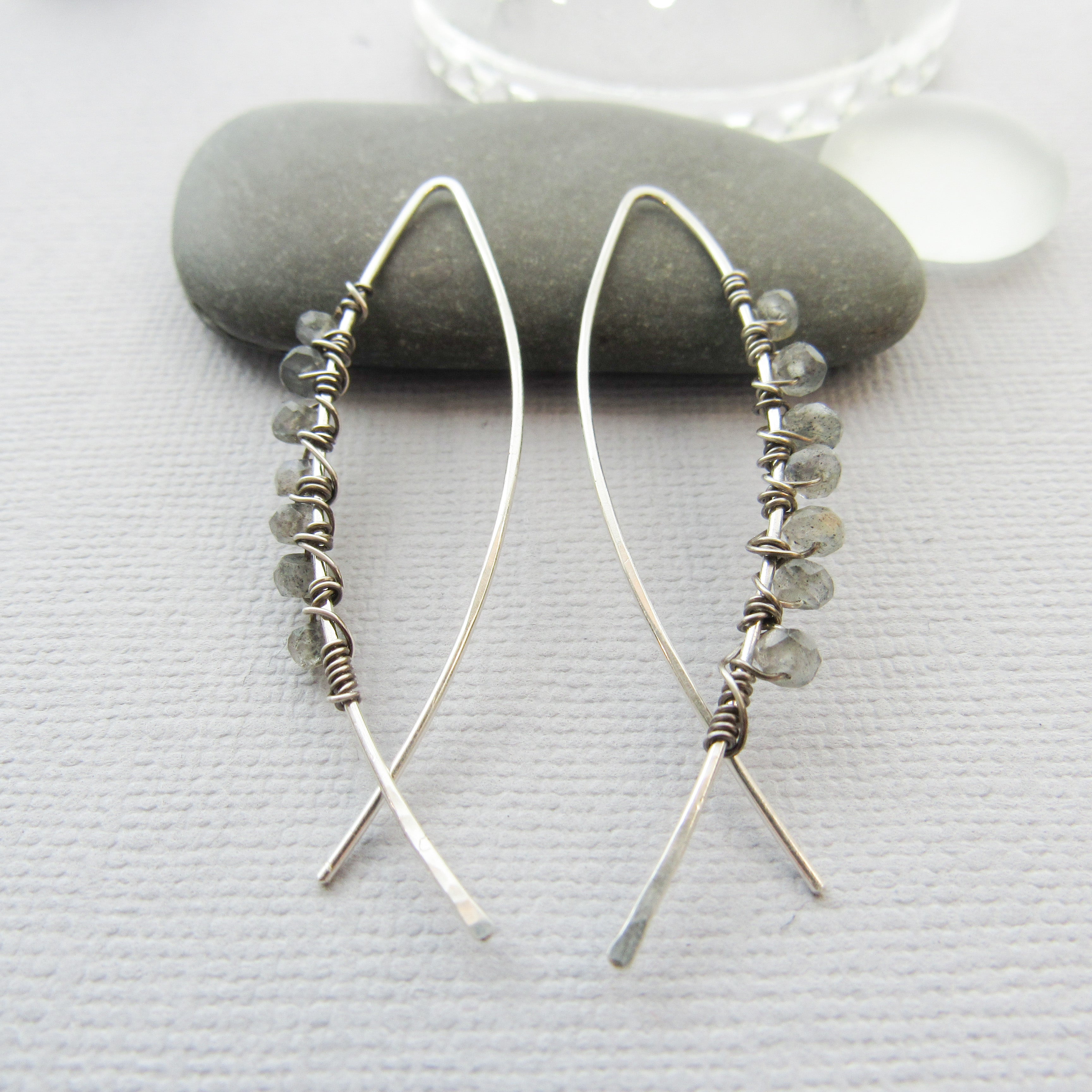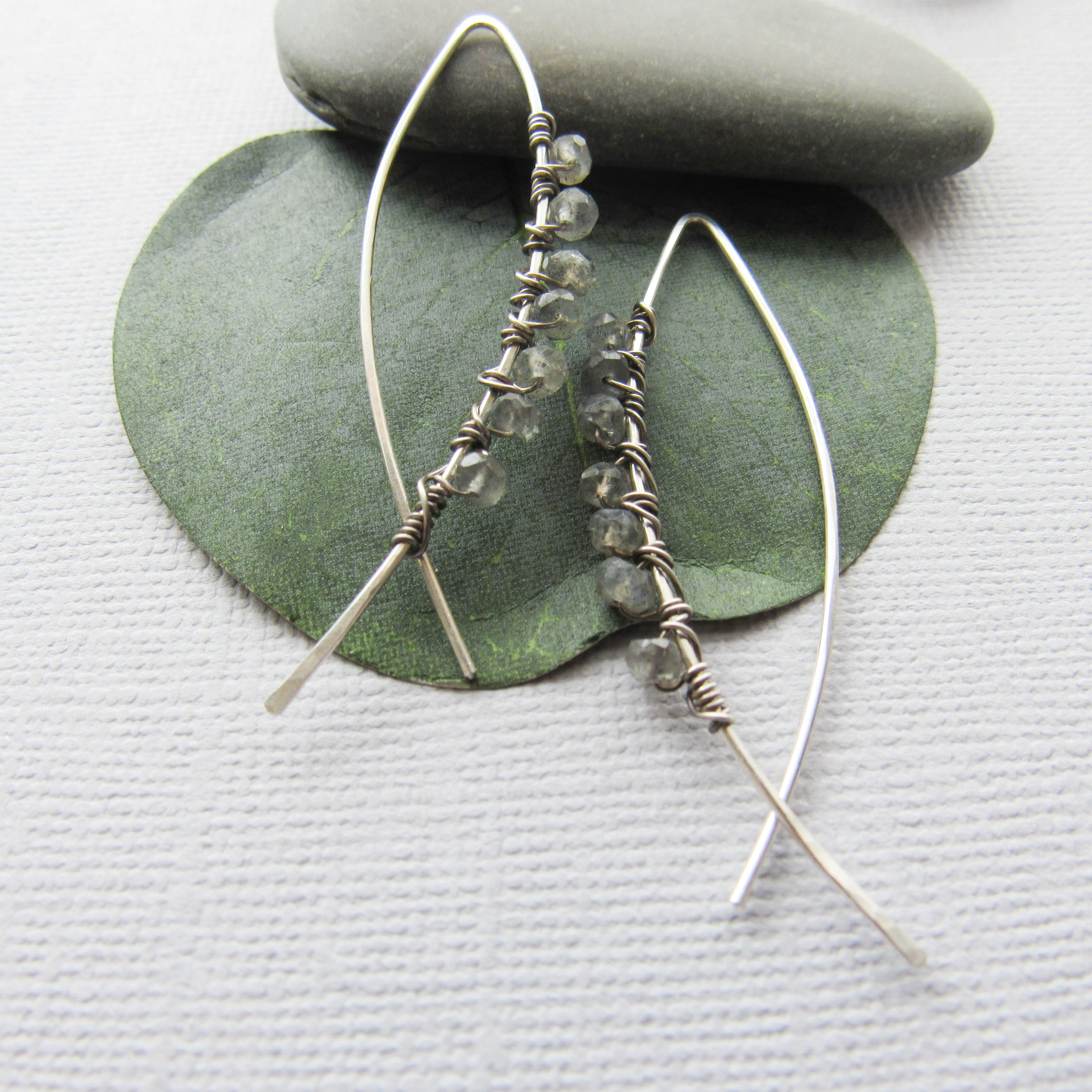 Silver wire is formed and hammered into a lovely free form feather shape and then wrapped with small flashy blue/gray labradorite beads.