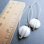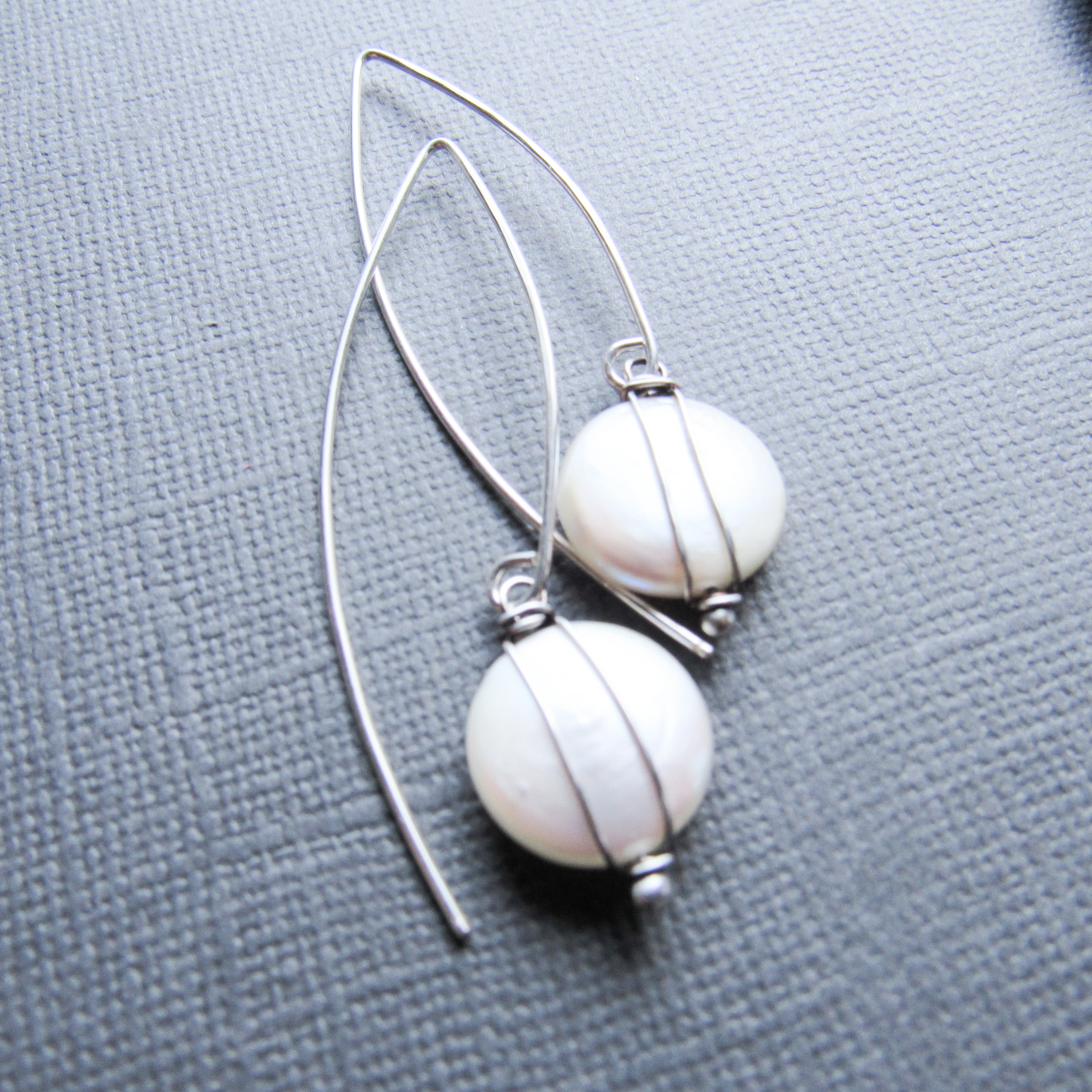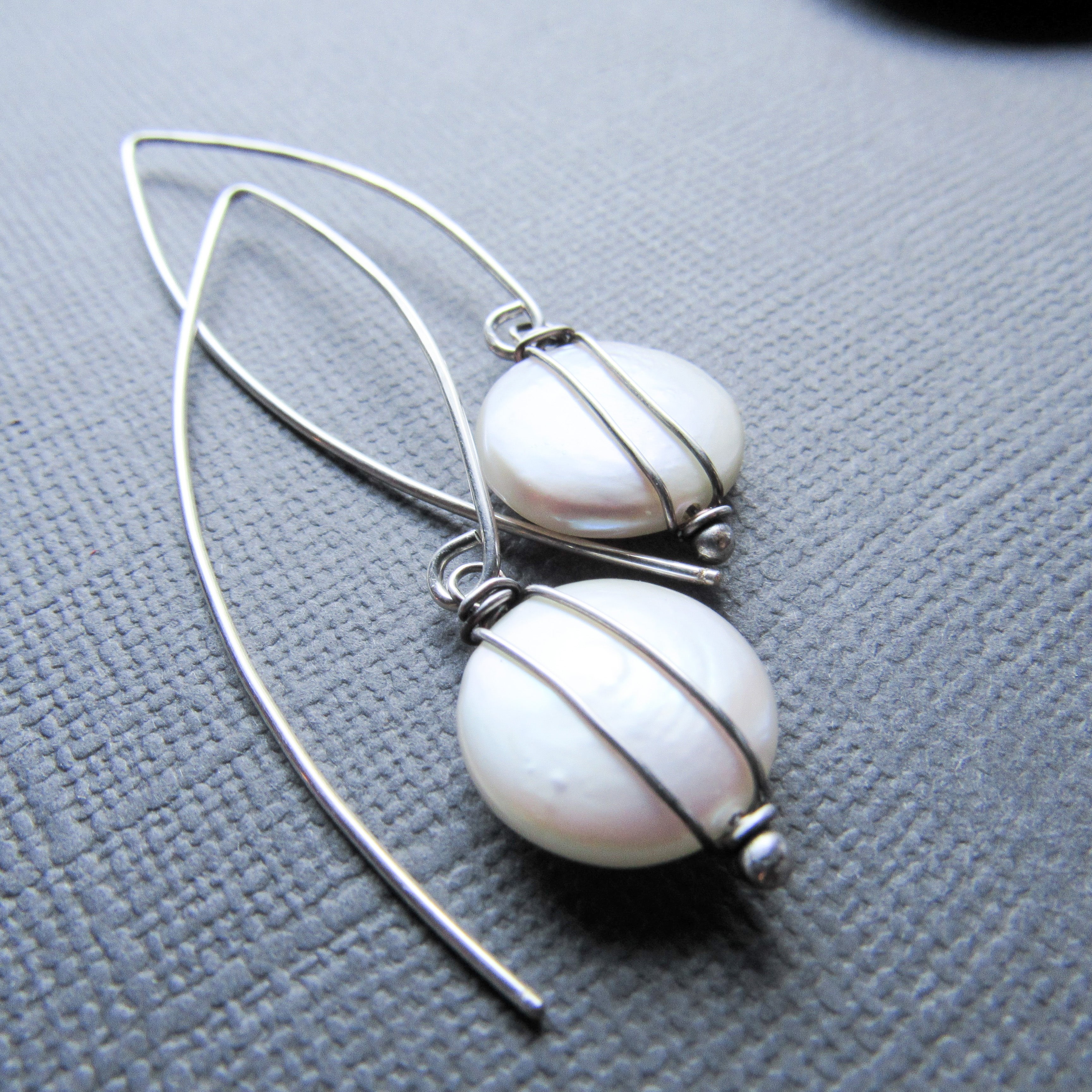 Beautiful white coin pearl earrings are wrapped with oxidized sterling silver.
