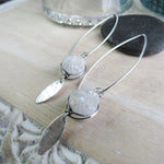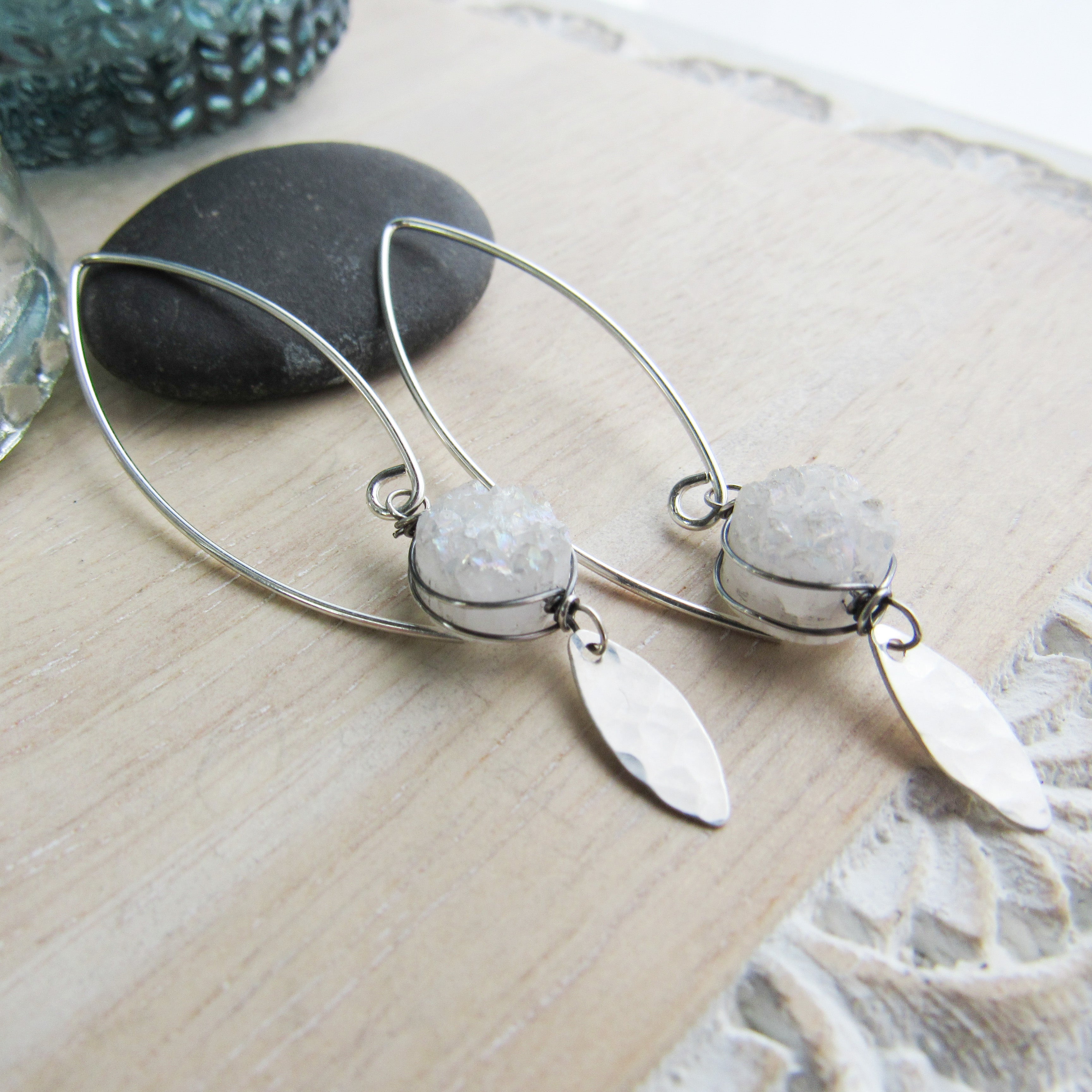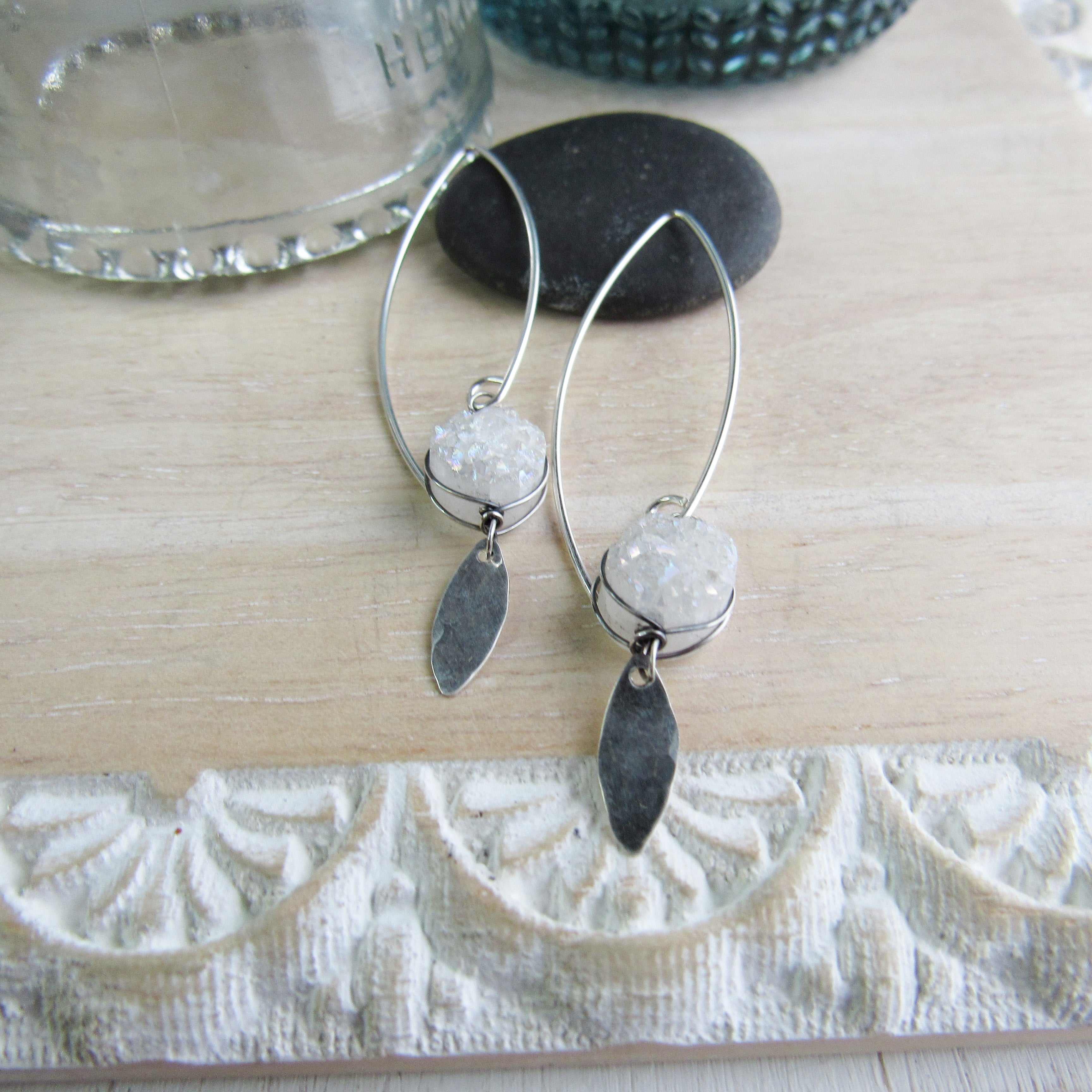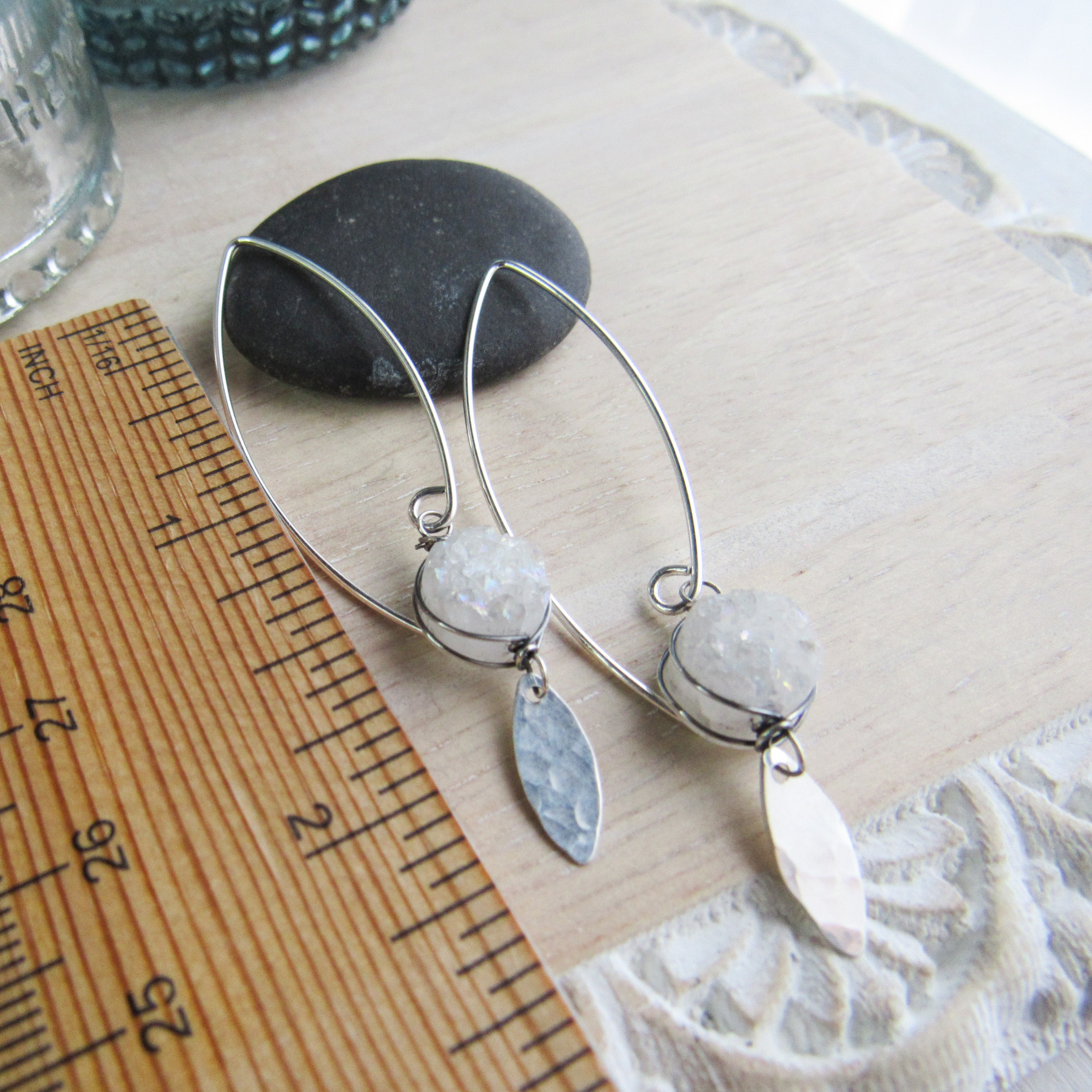 Long White Druzy Earrings with Hammered Silver Leaf Charm