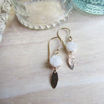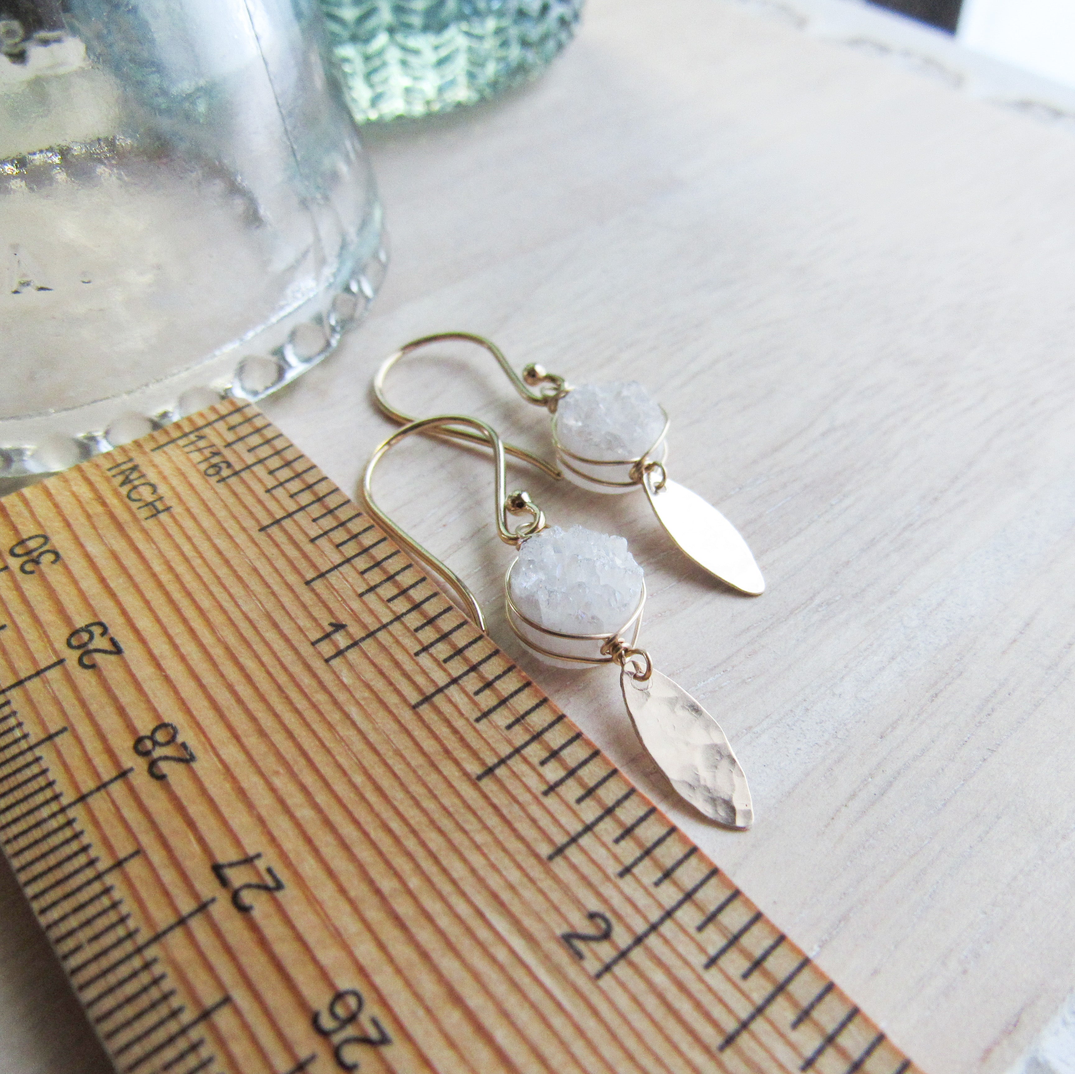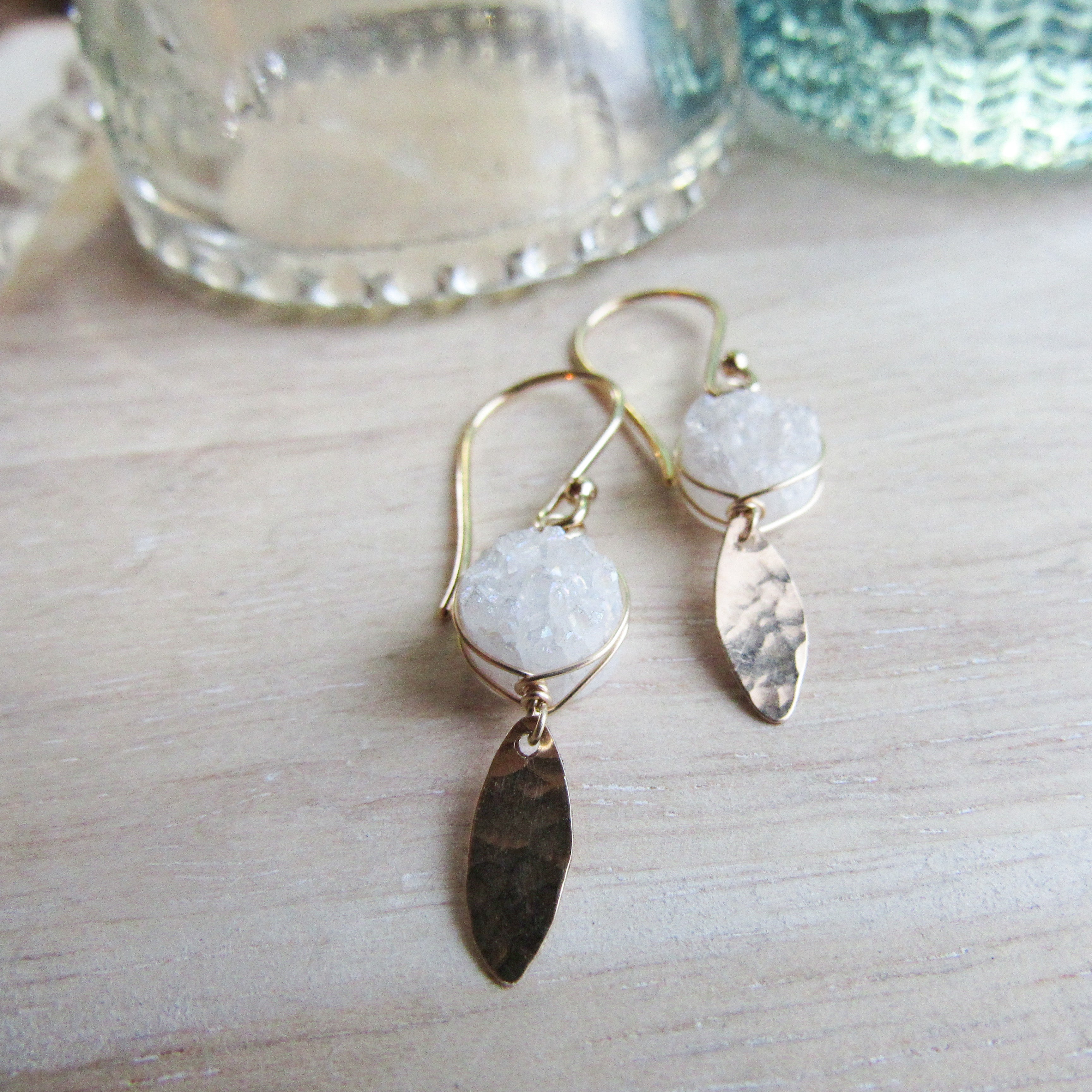 These easy-to-wear earrings feature white druzy surrounded by a 14K gold-filled wire wrap setting. The sparkling druzy stone contrasts with the elegant gold-filled setting, creating a sophisticated look. These earrings will bring a touch of sparkle to any outfit.